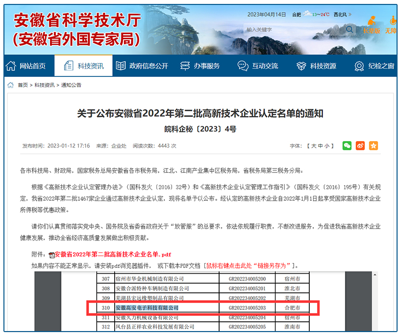 根據《高新技術企業認定管理辦法》和《高新技術企業認定管理工作指引》有關規定,我司已于2023年1月12日在安徽省認定機構2022年第二批高新技術企業認證備案公示名錄內,現已公式完畢。