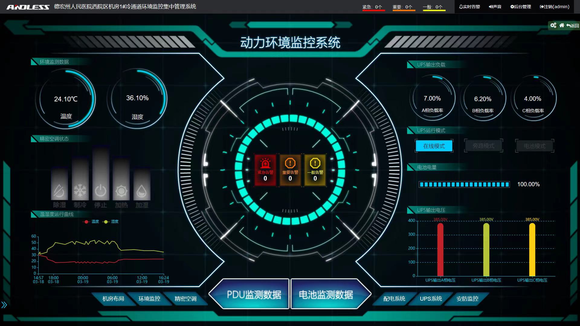 安德力士公司為德宏州醫院信息化建設提供支持,為貴院數據機房建設2套GLM微模塊機房系統,包含UPS不間斷電源系統、精密空調系統、環境檢測系統、配電系統、PDU監測系統以及一套環境監控集中管理系統,設備現已安裝調試完成。貴院機房建設使用4套UPS電源系統,2套UPS電源為數據中心機房IT設備提供后備電源保障,2套為醫院大樓弱電井系統提供后備保障。機房使用9臺行間空調,2臺房間級基站空調,11臺空調為機房提供一個恒溫恒濕的良好運行環境。